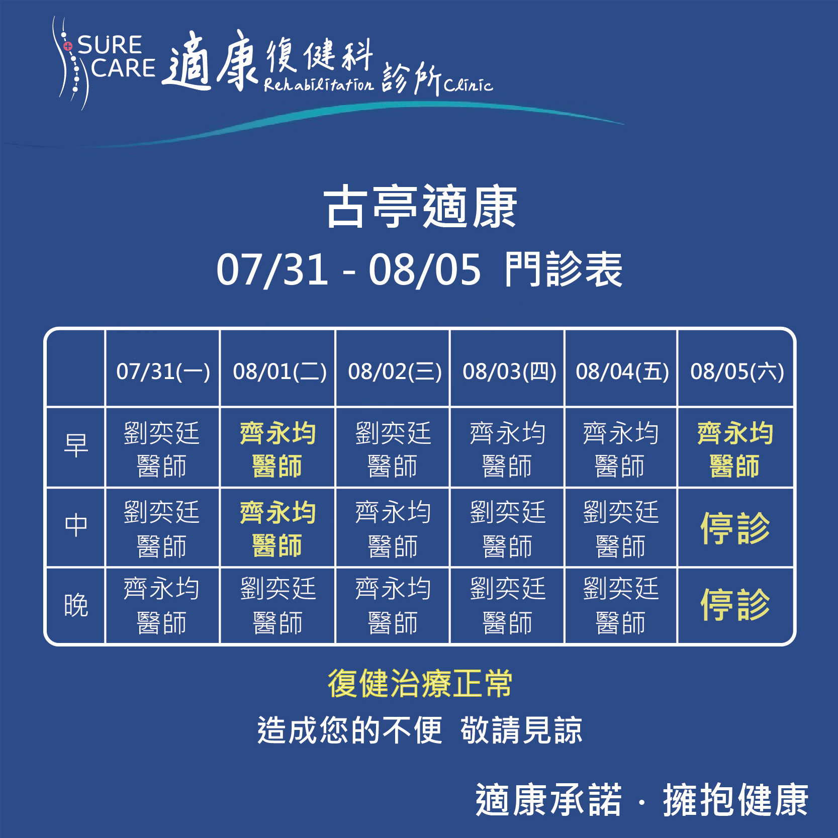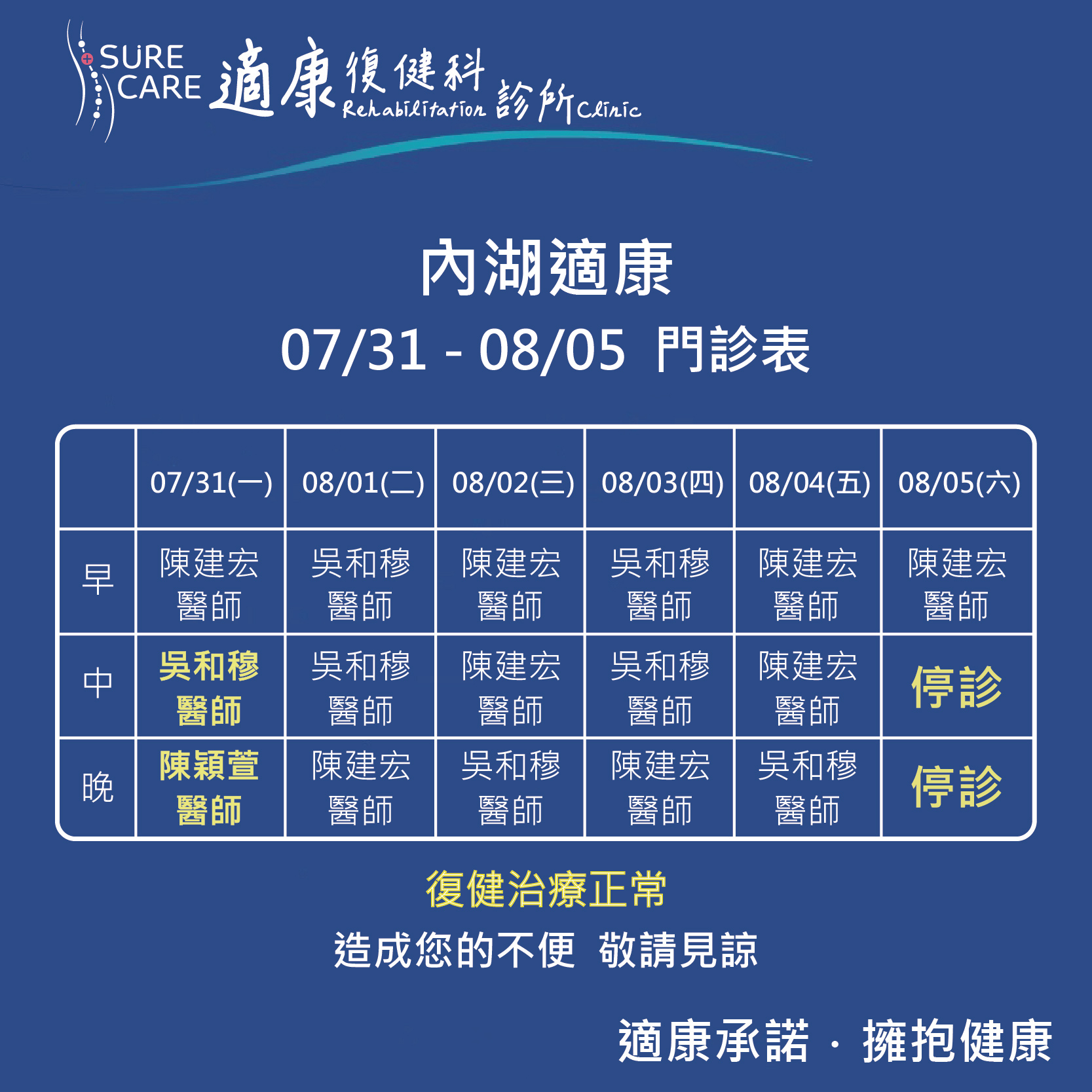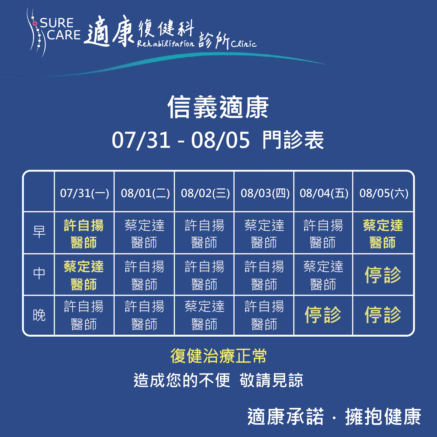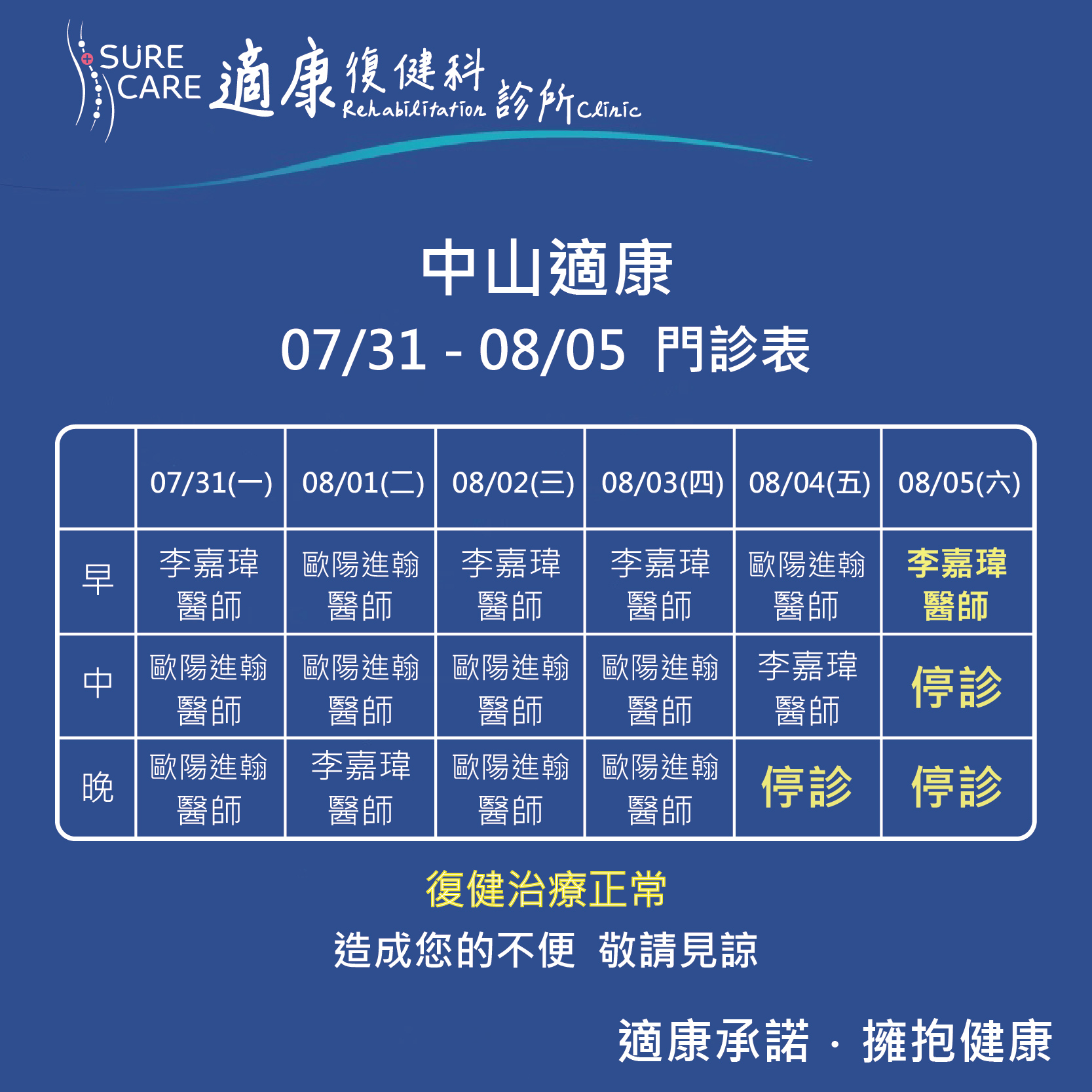 📣#適康復健 2023/07/31(一)至08/05(六)各院門診表時間表