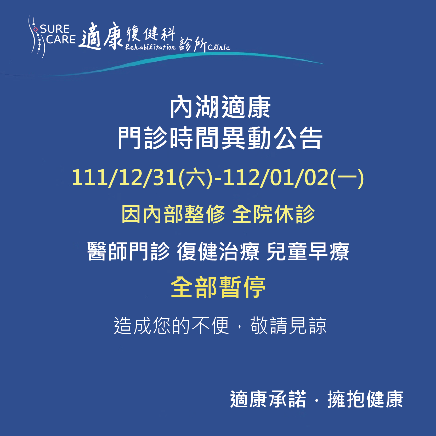 【內湖適康|12/31(六)~01/02(一)門診時間異動公告】