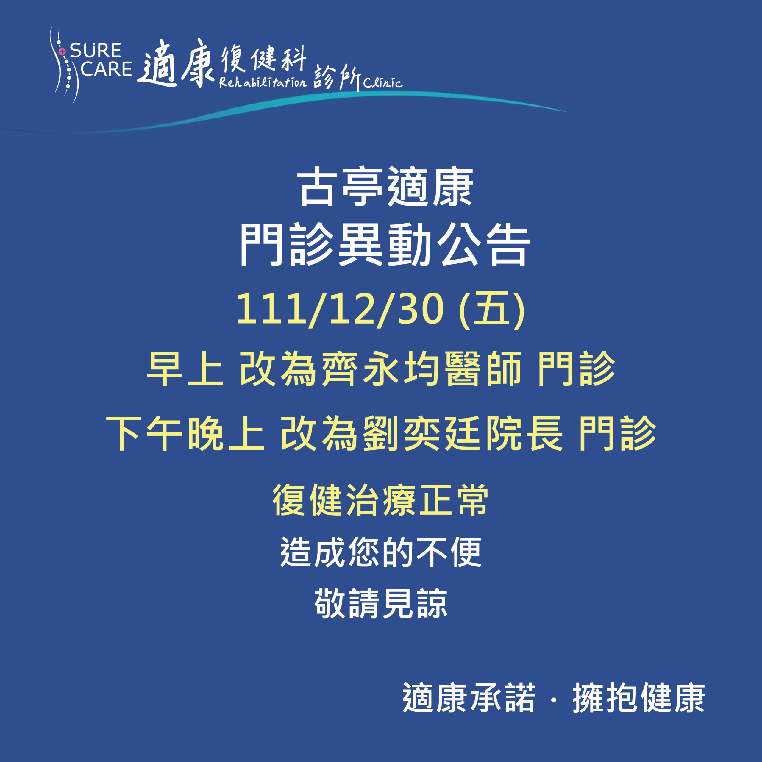 【古亭適康|12/30(五)門診異動公告】