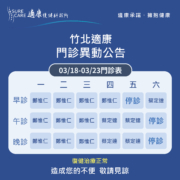 【竹北適康|03/18(一) ~03/23(六) 門診異動公告】