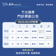 【竹北適康|113/06/10(一)~113/06/15(六)門診異動公告】